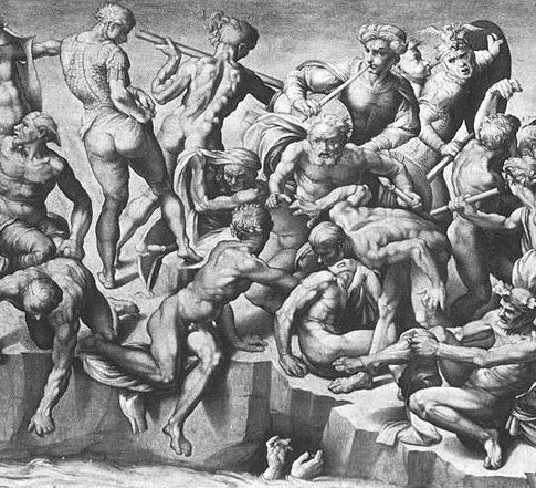Acima, Batalha de Cascina, de Michelangelo (esboços e reprodução de Aristotele da Sangalo) e abaixo, Batalha de Anghiari de Leonardo Da Vinci (esboços e reprodução de Rubens)